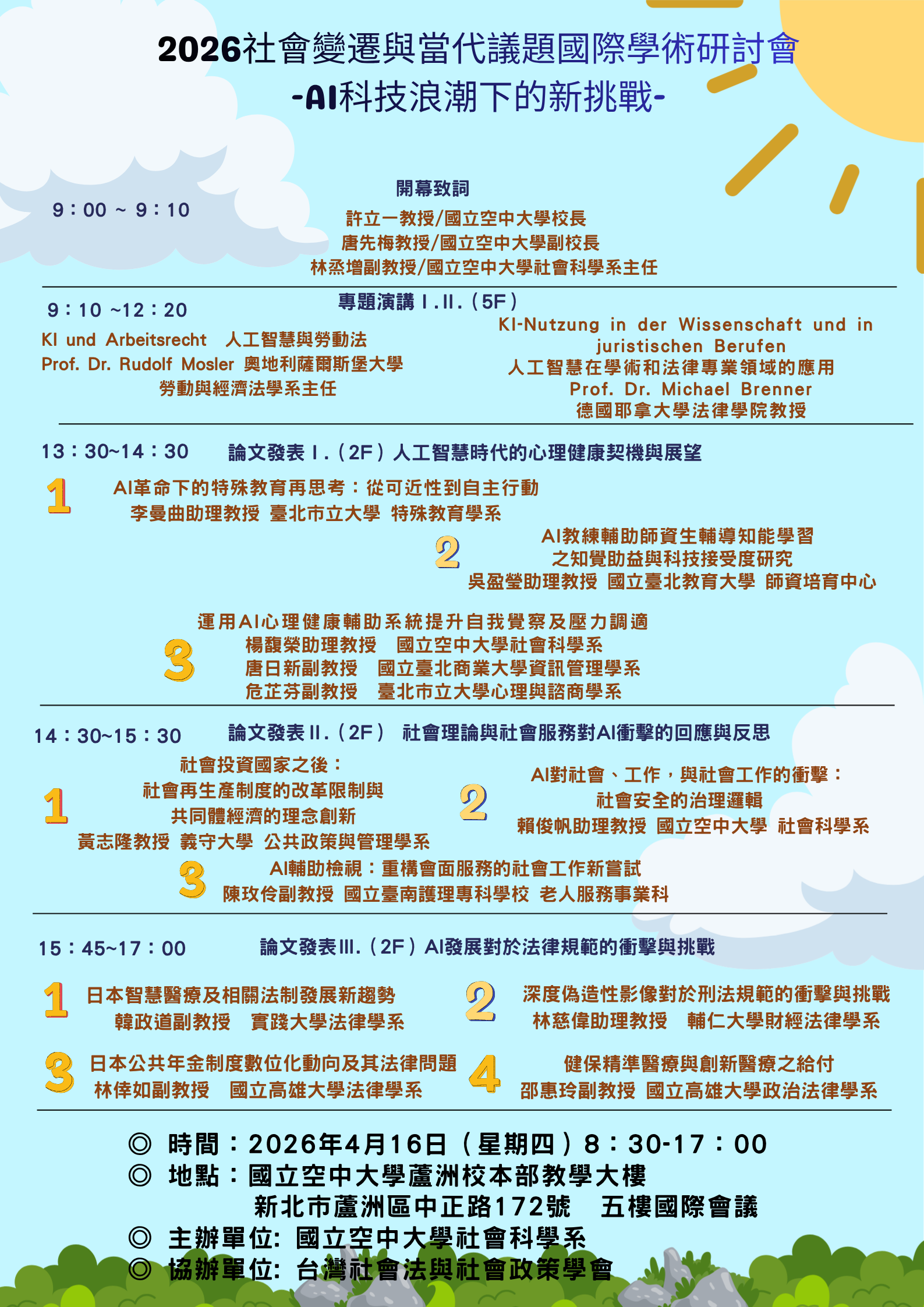 一、國立空中大學社會科學系與台灣社會法與社會政策學會於中華民國115年4月16日(星期四)8時30分至17時,在本校校本部教學大樓五樓國際會議廳及二樓智能會議室,合辦旨揭國際學術研討會,本次特別邀請奧地利薩爾斯堡大學勞動與經濟法學系主任Prof. Dr. Rudolf Mosler,和德國耶拿大學法律學院教授Prof. Dr. Michael Brenner蒞校專題演講。